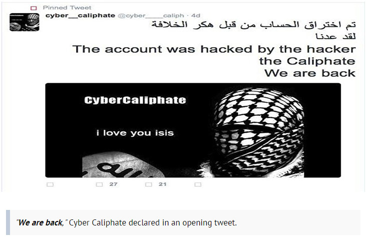 Cyber Khilafah, sebuah kelompok hacker yang didirikan oleh anggota British ISIS yang bernama Junaid Hussain, kelompok ini mendesak para pendukungnya dan para pengikutnya untuk hack akun Twitter dalam rangka untuk membalas dendam kematian Husain.